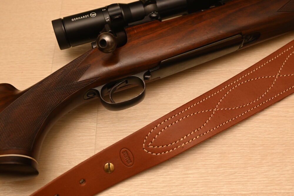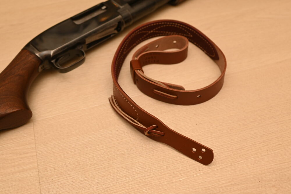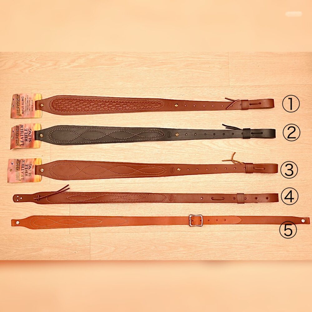 いまでは貴重な存在となったMade in USAの狩猟用の本革スリングです。肩当て部分が幅広になっており、ライフルを肩に担ぎやすくなっています。